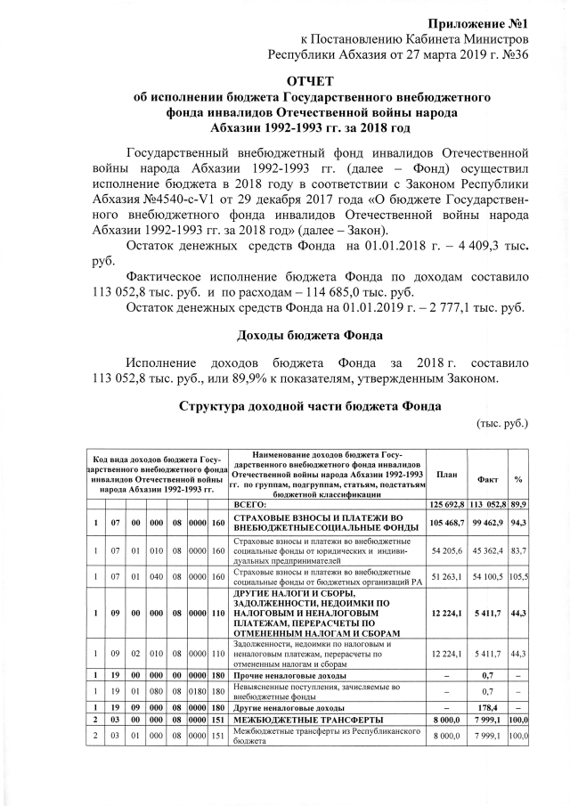 Постановление Кабинета Министров Республики Абхазия от 27.03.2019 №36 "Об исполнении бюджета Государственного внебюджетного фонда инвалидов Отечественной войны народа Абхазии 1992-1993 гг. за 2018 год"