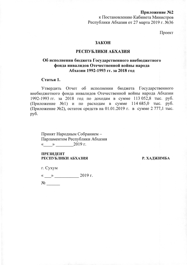 Постановление Кабинета Министров Республики Абхазия от 27.03.2019 №36 "Об исполнении бюджета Государственного внебюджетного фонда инвалидов Отечественной войны народа Абхазии 1992-1993 гг. за 2018 год"