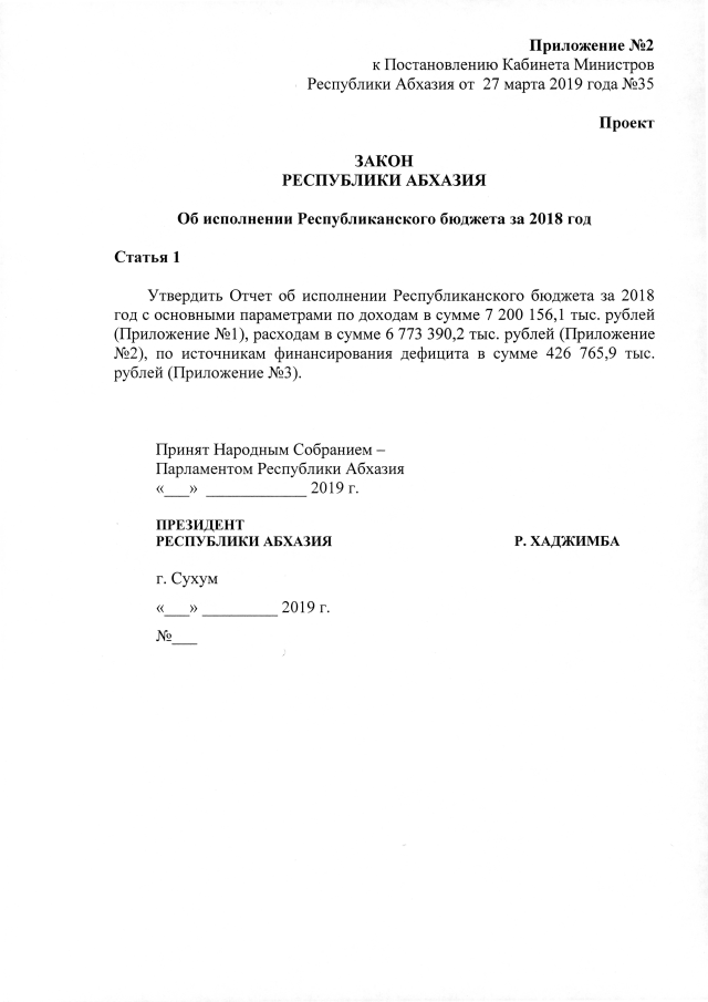 Постановление Кабинета Министров Республики Абхазия от 27.03.2019 №35 "Об исполнении республиканского бюджета за 2018год"