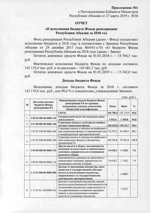 Постановление Кабинета Министров Республики Абхазия от 27.03.2019 №38 "Об исполнении бюджета Фонда репатриации Республики Абхазия за 2018 год"