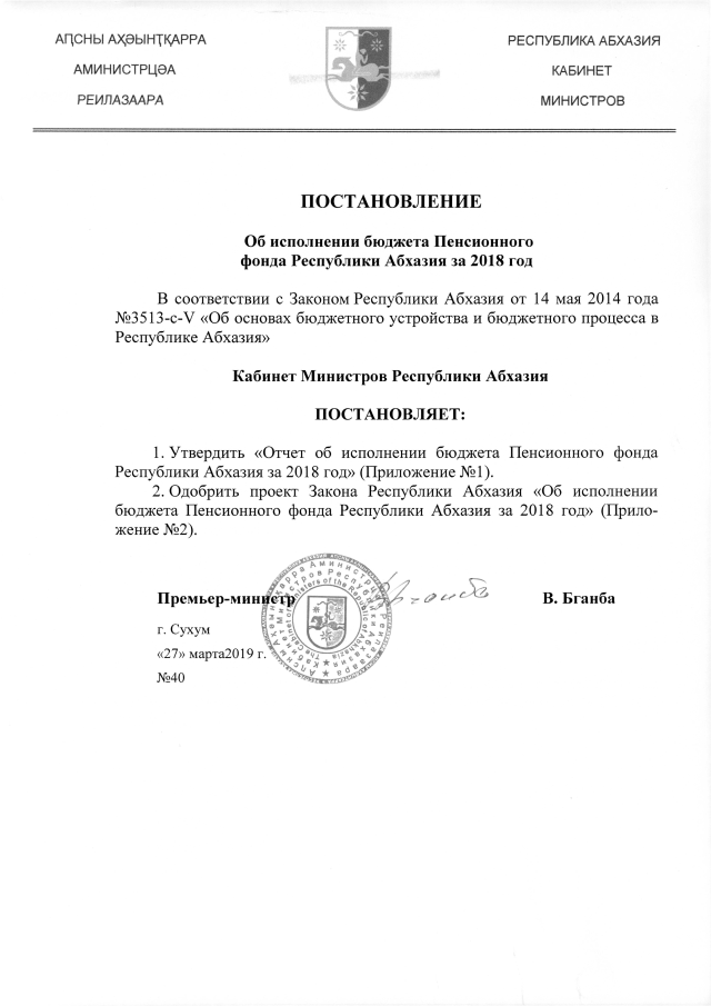 Постановление Кабинета Министров Республики Абхазия от 27.03.2019 №40 "Об исполнении бюджета Пенсионного Фонда Республики Абхазия за 2018 год"