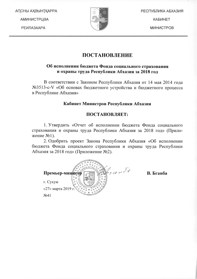 Постановление Кабинета Министров Республики Абхазия от 27.03.2019 №41 "Об исполнении бюджета Фонда социального страхования и охраны труда Республики Абхазия за 2018 года"