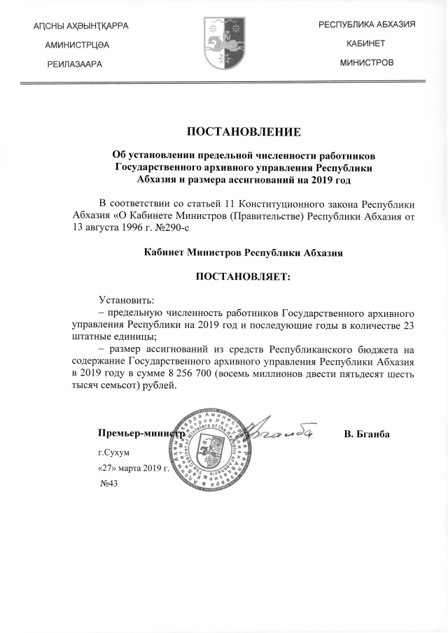 Постановление Кабинета Министров Республики Абхазия от 27.03.2019 №43 "Об установлении предельной численности работников Государственного архивного управления Республики Абхазия и размера ассигнований на 2019 год"
