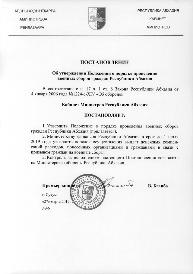 Постановление Кабинета Министров Республики Абхазия от 27.03.2019 №46 "Об утверждении Положения о порядке проведения военных сборов граждан Республики Абхазия"