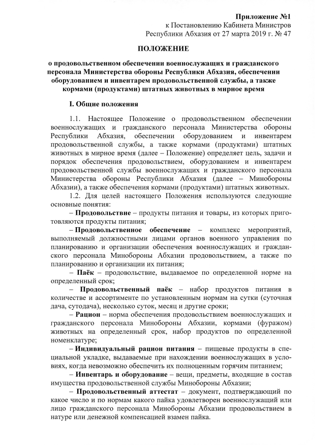 Постановление Кабинета Министров Республики Абхазия от 27.03.2019 №47 "Об утверждении Положения о продовольственном обеспечении военнослужащих и гражданского персонала Министерства обороны Республики Абхазия, обеспечении оборудованием и инвентарем продовольственной службы, а также кормами (продуктами) штатных животных в мирное время и Норм выдачи продовольствия общевойскового, лётного, лечебного, индивидуального пайка военнослужащим и гражданскому персоналу Министерства обороны Республики Абхазия, а также кормов (продуктов) штатным животным в мирное время> "