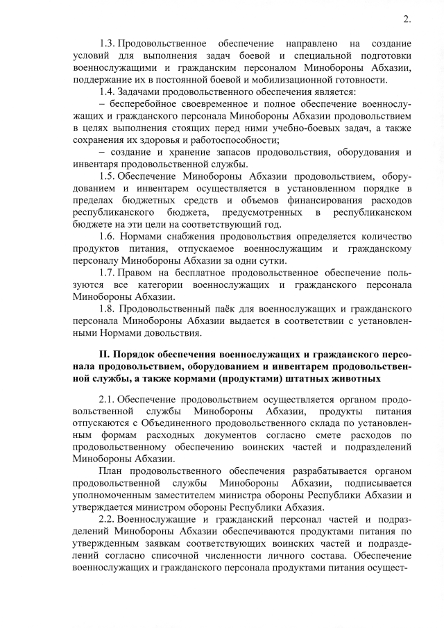 Постановление Кабинета Министров Республики Абхазия от 27.03.2019 №47 "Об утверждении Положения о продовольственном обеспечении военнослужащих и гражданского персонала Министерства обороны Республики Абхазия, обеспечении оборудованием и инвентарем продовольственной службы, а также кормами (продуктами) штатных животных в мирное время и Норм выдачи продовольствия общевойскового, лётного, лечебного, индивидуального пайка военнослужащим и гражданскому персоналу Министерства обороны Республики Абхазия, а также кормов (продуктов) штатным животным в мирное время> "