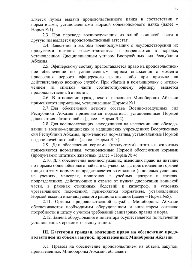 Постановление Кабинета Министров Республики Абхазия от 27.03.2019 №47 "Об утверждении Положения о продовольственном обеспечении военнослужащих и гражданского персонала Министерства обороны Республики Абхазия, обеспечении оборудованием и инвентарем продовольственной службы, а также кормами (продуктами) штатных животных в мирное время и Норм выдачи продовольствия общевойскового, лётного, лечебного, индивидуального пайка военнослужащим и гражданскому персоналу Министерства обороны Республики Абхазия, а также кормов (продуктов) штатным животным в мирное время> "
