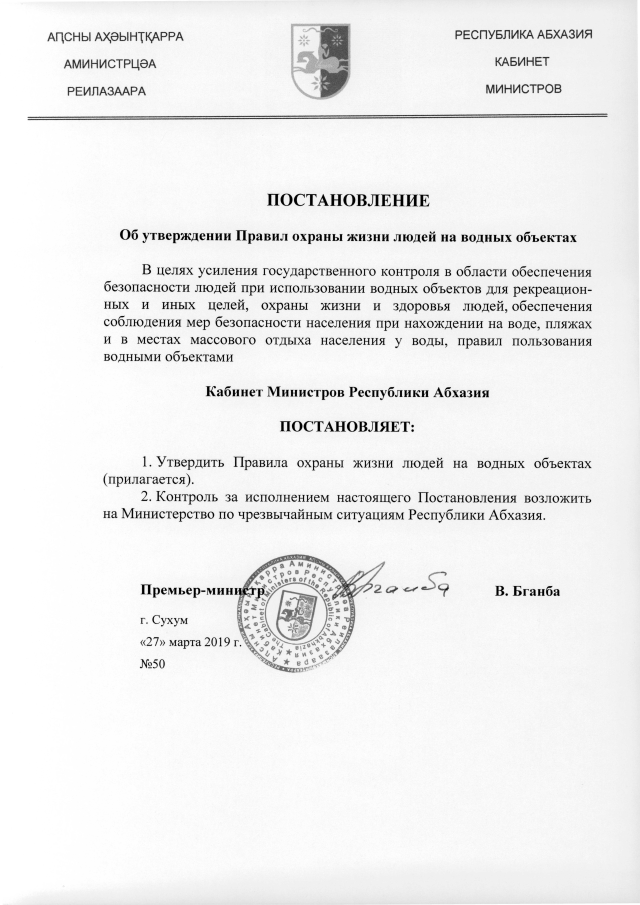 Постановление Кабинета Министров Республики Абхазия от 27.03.2019 №50 "Об утверждении Правил охраны жизни людей на водных объектах"