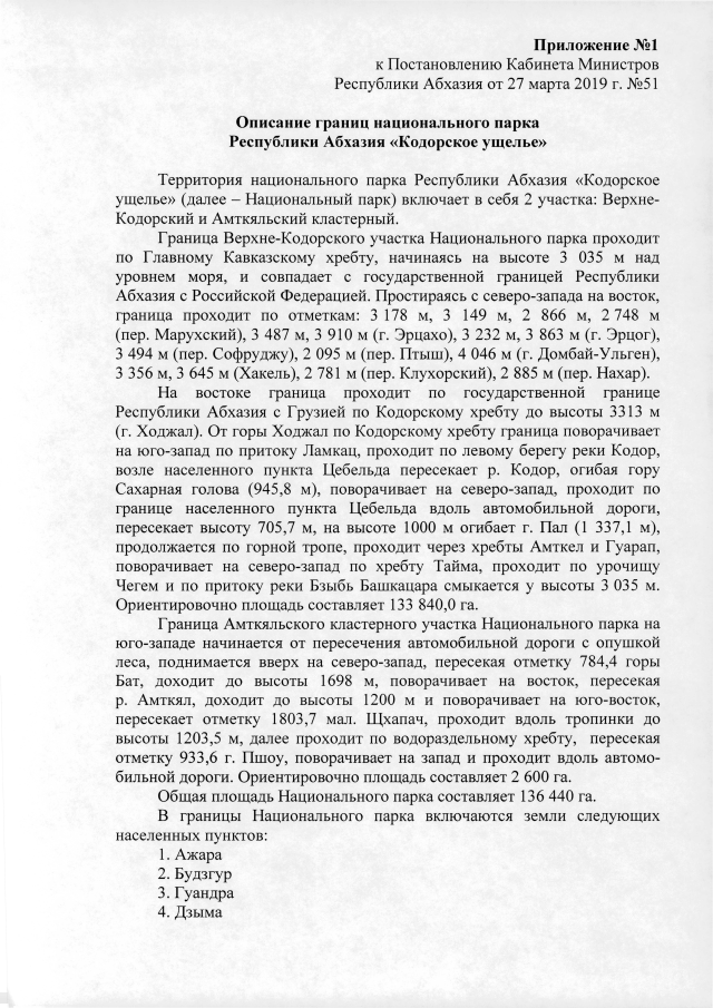 Постановление Кабинета Министров Республики Абхазия от 27.03.2019 №51 "Об образовании национального парка Республики Абхазия <Кодорское ущелье>"
