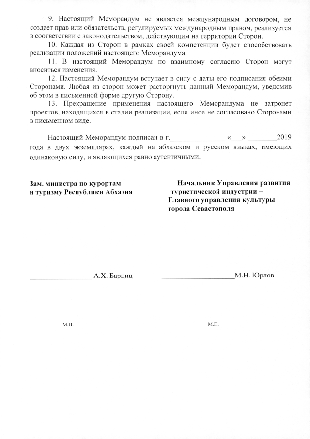Постановление Кабинета Министров Республики Абхазия от 19.04.2019 №56 "О подписании Меморандума о взаимопонимании между Министерством по курортам и туризму Республики Абхазия и Управлением развития туристической индустрии - Главного управления культуры города Севастополь"