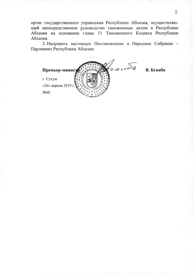 Постановление Кабинета Министров Республики Абхазия от 26.04.2019 №60 "О внесении изменения в "Перечень технологического оборудования (в том числе комплектующих и запасных частей к нему), аналоги которого не производятся на территории Республики Абхазия, необходимого для создания производства товаров, ввоз которого на таможенную территорию Республики Абхазия не подлежит налогообложению (освобождается от налогообложения)", утвержденный Постановлением Кабинета Министров Республики Абхазия от 27 мая 2016 года №87"