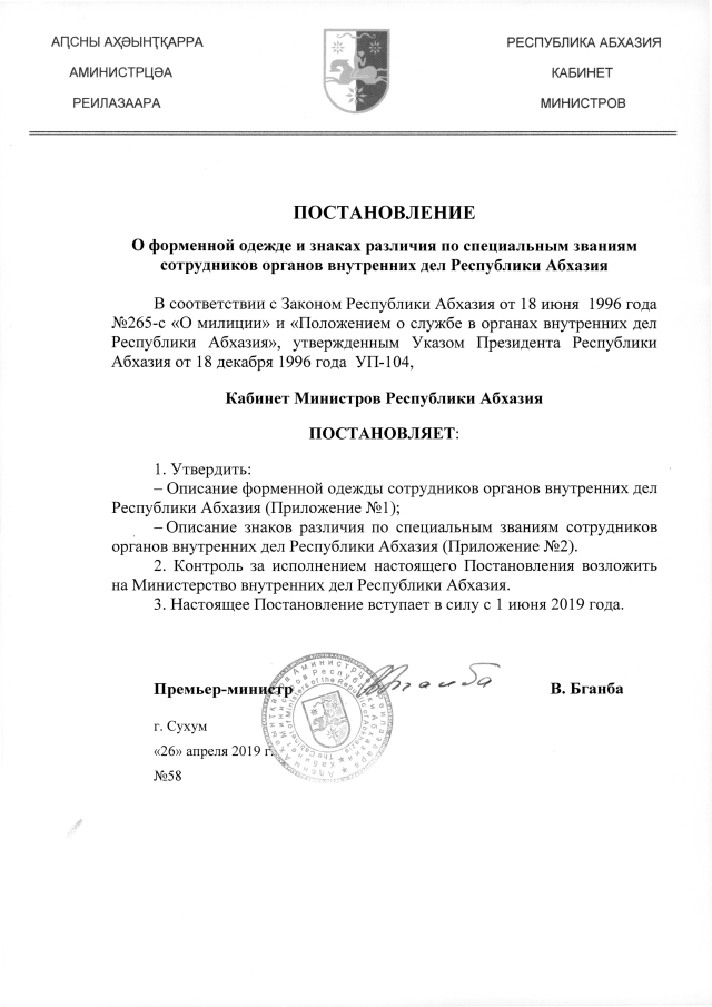 Постановление Кабинета Министров Республики Абхазия от 26.04.2019 №58 "О форменной одежде и знаках различия по специальным званиям сотрудников органов внутренних дел Республики Абхазия"