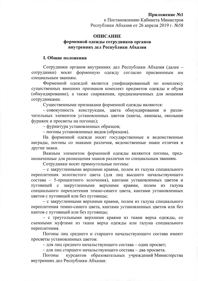 Постановление Кабинета Министров Республики Абхазия от 26.04.2019 №58 "О форменной одежде и знаках различия по специальным званиям сотрудников органов внутренних дел Республики Абхазия"