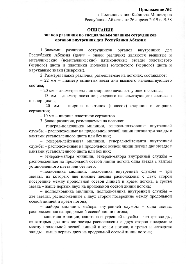Постановление Кабинета Министров Республики Абхазия от 26.04.2019 №58 "О форменной одежде и знаках различия по специальным званиям сотрудников органов внутренних дел Республики Абхазия"