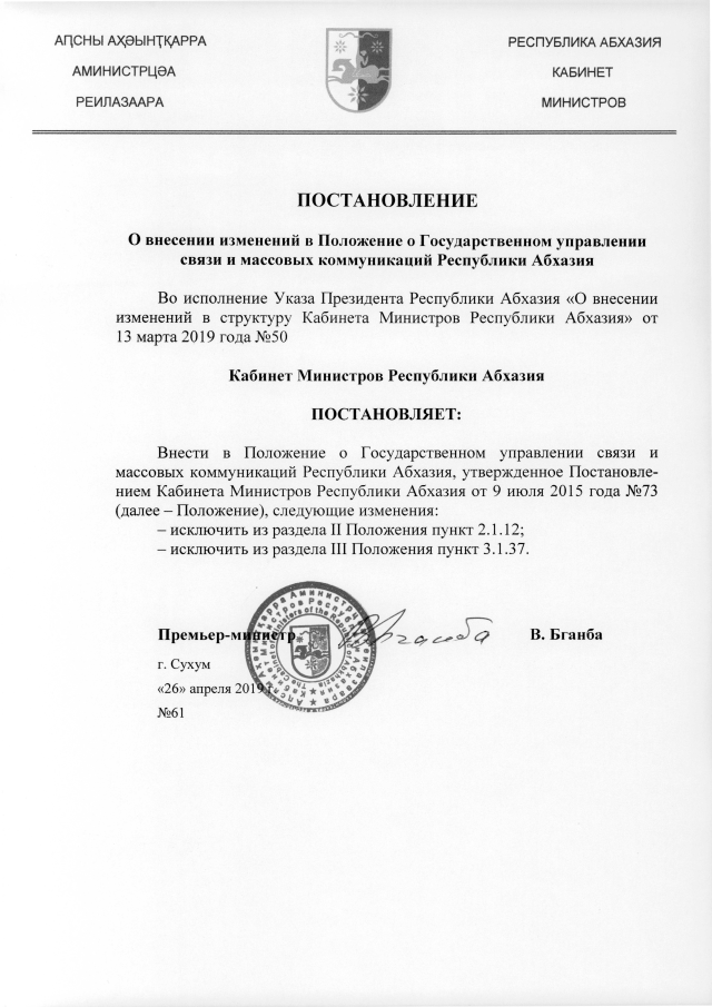 Постановление Кабинета Министров Республики Абхазия от 26.04.2019 №61 "О внесении изменений в Положение о Государственном управлении связи и массовых коммуникаций Республики Абхазия"