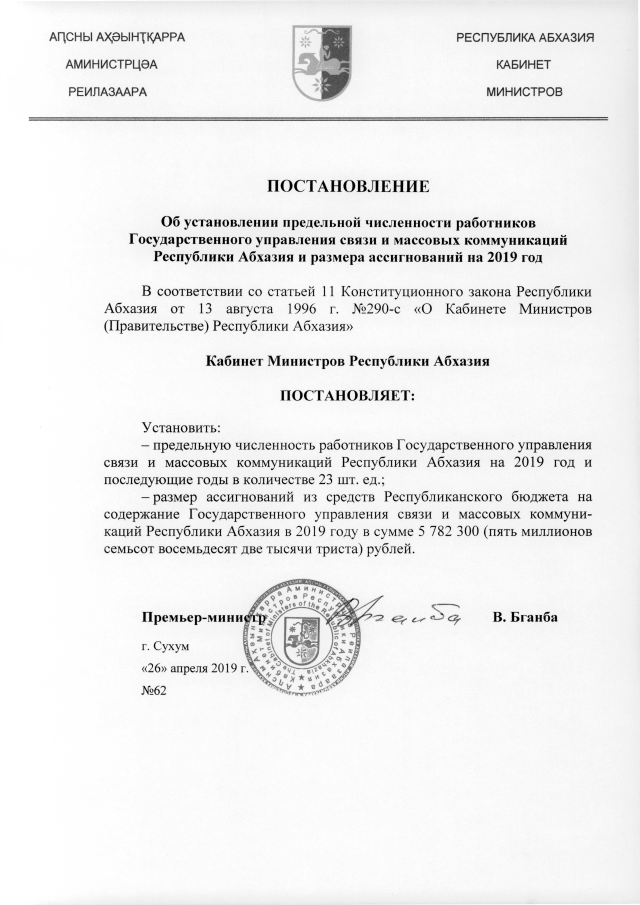 Постановление Кабинета Министров Республики Абхазия от 26.04.2019 №62 "Об установлении предельной численности работников Государственного управления связи и массовых коммуникаций Республики Абхазия и размера ассигнований на 2019 год"