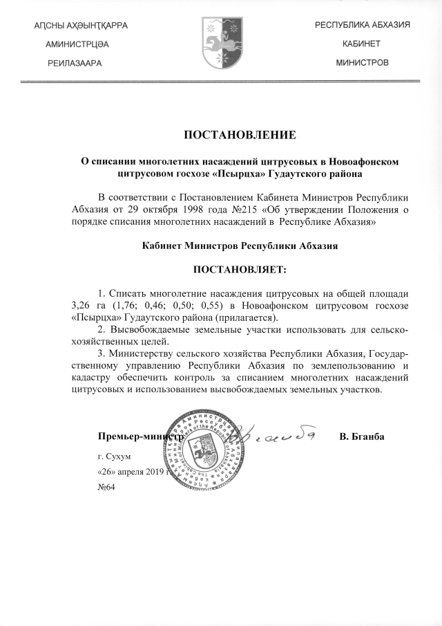 Постановление Кабинета Министров Республики Абхазия от 26.04.2019 №64 "О списании многолетних насаждений цитрусовых в Новоафонском цитрусовом госхозе "Псырцха" Гудаутского района"