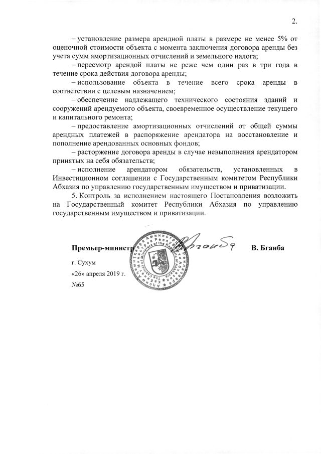 Постановление Кабинета Министров Республики Абхазия от 26.04.2019 №65 "Об изъятии имущественного комплекса спортивного лицея Государственного комитета по делам молодежи и спорту Республики Абхазия и последующей передаче Государственным комитетом Республики Абхазия по управлению государственным имуществом и приватизации в аренду ООО "ГЕЧ""