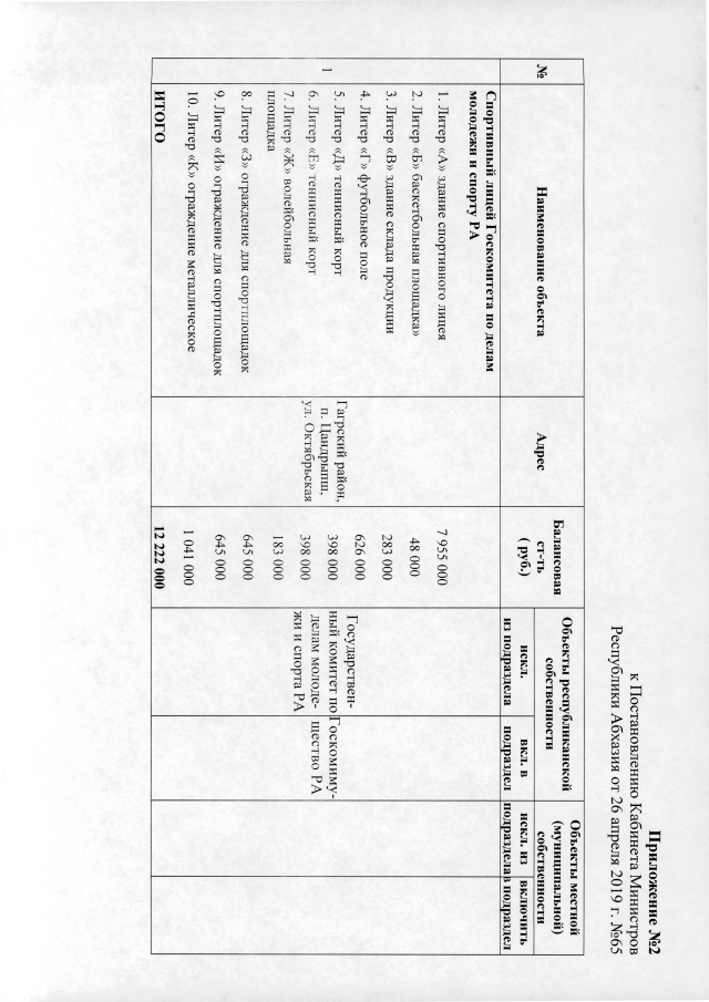 Постановление Кабинета Министров Республики Абхазия от 26.04.2019 №65 "Об изъятии имущественного комплекса спортивного лицея Государственного комитета по делам молодежи и спорту Республики Абхазия и последующей передаче Государственным комитетом Республики Абхазия по управлению государственным имуществом и приватизации в аренду ООО "ГЕЧ""