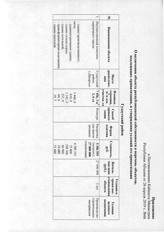 Постановление Кабинета Министров Республики Абхазия от 26.04.2019 №66 "О включении имущественного комплекса кирпичного завода в с. Джырхуа Гудаутского района в перечень объектов, подлежащих приватизации, и утверждении условий его приватизации"