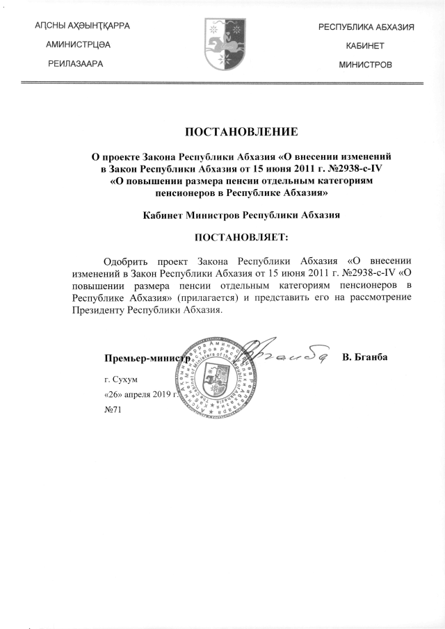 Постановление Кабинета Министров Республики Абхазия от 26.04.2019 №71 "О проекте Закона Республики Абхазия <О внесении изменений в Закон Республики Абхазия от 15 июня 2011 г. №2938-с-IV "О повышении размера пенсии отдельным категориям пенсионеров в Республике Абхазия""