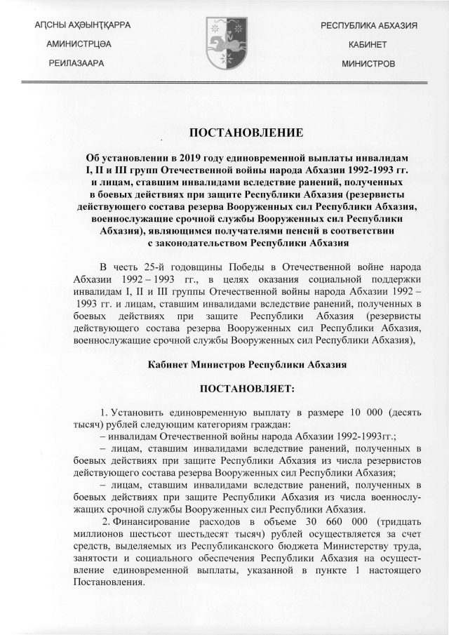 Постановление Кабинета Министров Республики Абхазия от 03.05.2019 №73 "Об установлении в 2019 году единовременной выплаты инвалидам I, II и III групп Отечественной войны народа Абхазии 1992-1993 гг. и лицам, ставшим инвалидами вследствие ранений, полученных в боевых действиях при защите Республики Абхазия (резервисты действующего состава резерва Вооруженных сил Республики Абхазия,военнослужащие срочной службы Вооруженных сил Республики Абхазия), являющимся получателями пенсий в соответствии с законодательством Республики Абхазия"