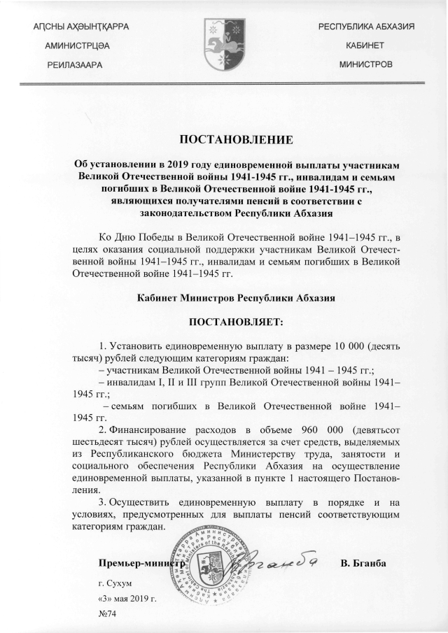 Постановление Кабинета Министров Республики Абхазия от 03.05.2019 №74 "Об установлении в 2019 году единовременной выплаты участникам Великой Отечественной войны 1941-1945 гг., инвалидам и семьям погибших в Великой Отечественной войне 1941-1945 гг., являющихся получателями пенсий в соответствии с законодательством Республики Абхазия"