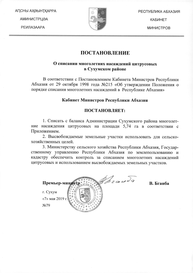 Постановление Кабинета Министров Республики Абхазия от 07.05.2019 №79 "О списании многолетних насаждений цитрусовых в Сухумском районе"