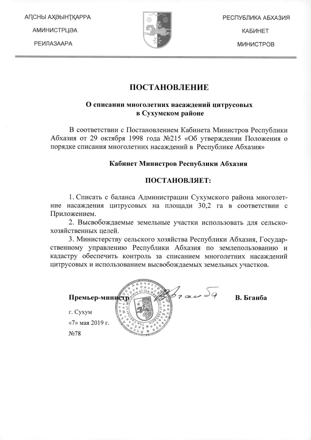 Постановление Кабинета Министров Республики Абхазия от 07.05.2019 №78 "О списании многолетних насаждений цитрусовых в Сухумском районе"