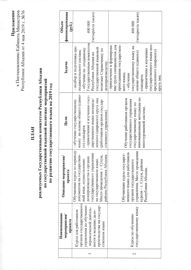 Постановление Кабинета Министров Республики Абхазия от 04.05.2019 №76 "Об утверждении Плана реализуемых Государственным комитетом Республики Абхазия по государственной языковой политике мероприятий по развитию государственного языка на 2019 год"