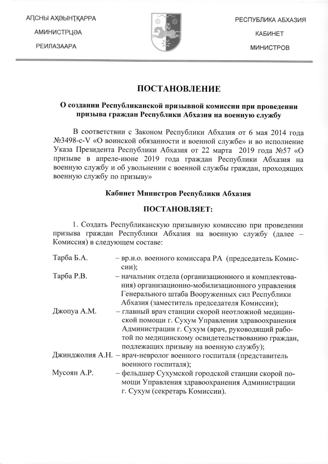 Постановление Кабинета Министров Республики Абхазия от 08.05.2019 №81 "О создании Республиканской призывной комиссии при проведении призыва граждан Республики Абхазия на военную службу"