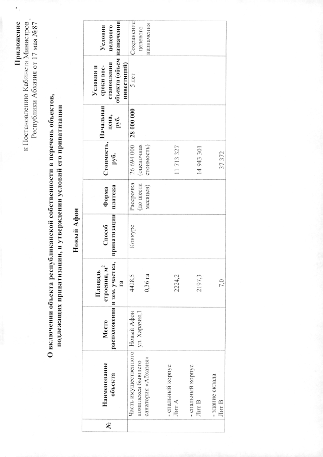 Постановление Кабинета Министров Республики Абхазия от 17.05.2019 №87 "О включении части имущественного комплекса бывшего санатория <Абхазия> в перечень объектов, подлежащих приватизации,и утверждении условий его приватизации"