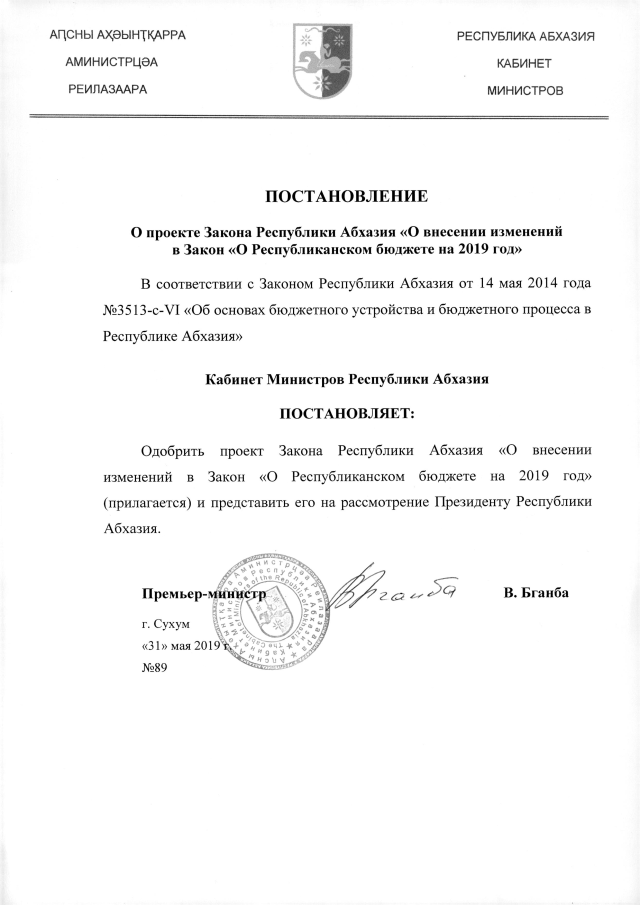 Постановление Кабинета Министров Республики Абхазия от 31.05.2019 №89 "О проекте Закона Республики Абхазия <О внесении изменений в Закон <О Республиканском бюджете на 2019 год>"