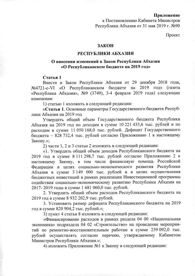Постановление Кабинета Министров Республики Абхазия от 31.05.2019 №89 "О проекте Закона Республики Абхазия <О внесении изменений в Закон <О Республиканском бюджете на 2019 год>"