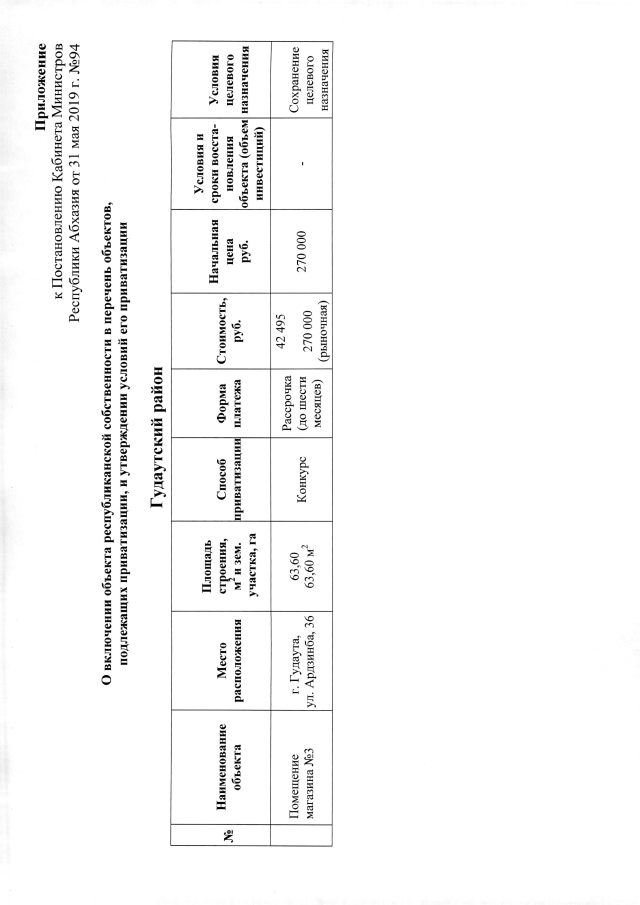 Постановление Кабинета Министров Республики Абхазия от 31.05.2019 №94 "О включении помещения магазина №3 в г. Гудаута в Перечень объектов, подлежащих приватизации,и утверждении условий его приватизации"