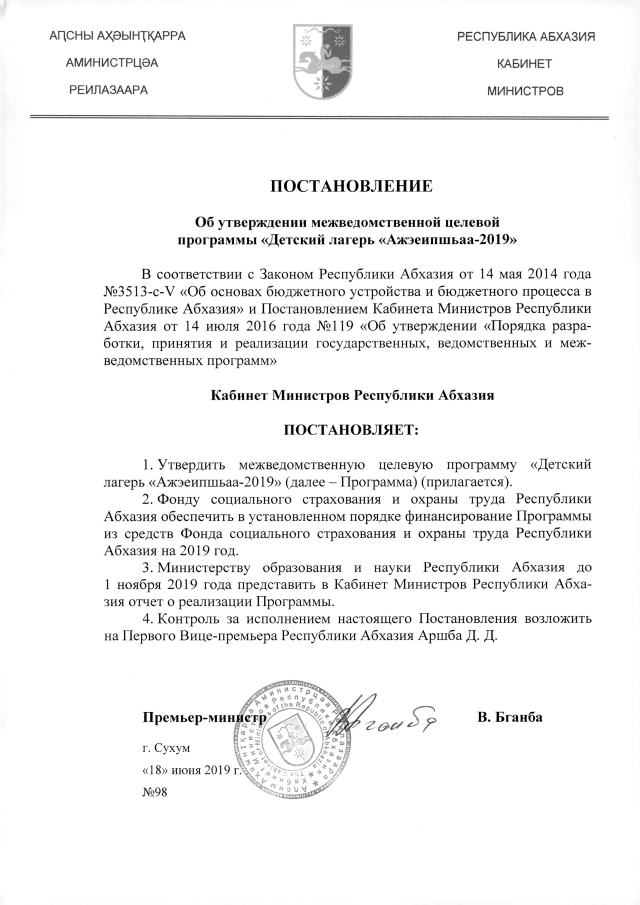 Постановление Кабинета Министров Республики Абхазия от 18.06.2019 №98 "Об утверждении межведомственной целевой программы <Детский лагерь <Ажэеипшьаа-2019>"