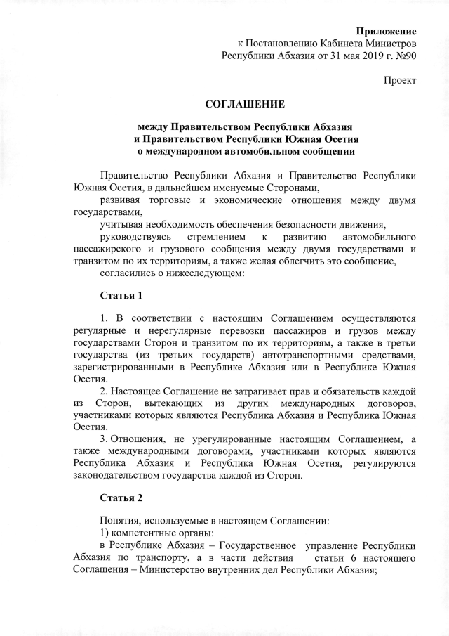 Постановление Кабинета Министров Республики Абхазия от 31.05.2019 №90 "О заключении Соглашения между Правительством Республики Абхазия и Правительством Республики Южная Осетия о международном автомобильном сообщении"
