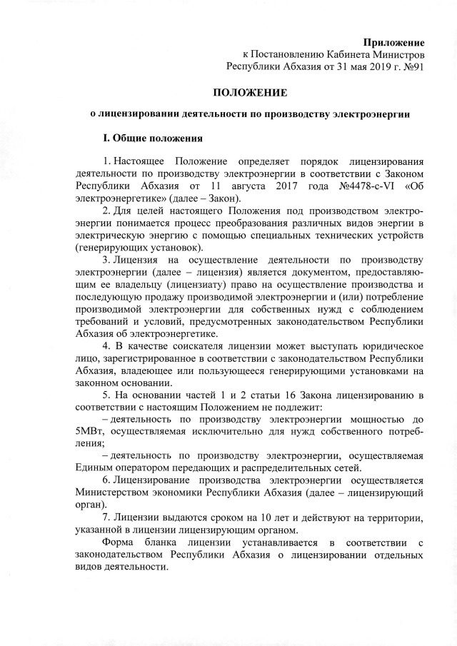 Постановление Кабинета Министров Республики Абхазия от 31.05.2019 №91 "Об утверждении Положения о лицензировании деятельности по производству электроэнергии"