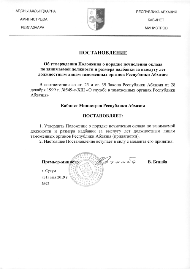 Постановление Кабинета Министров Республики Абхазия от 31.05.2019 №92 "Об утверждении Положения о порядке исчисления оклада по занимаемой должности и размера надбавки за выслугу лет должностным лицам таможенных органов Республики Абхазия "