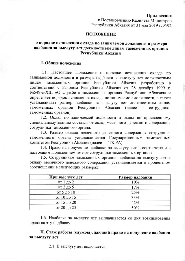 Постановление Кабинета Министров Республики Абхазия от 31.05.2019 №92 "Об утверждении Положения о порядке исчисления оклада по занимаемой должности и размера надбавки за выслугу лет должностным лицам таможенных органов Республики Абхазия "
