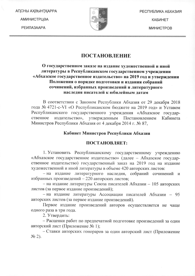 Постановление Кабинета Министров Республики Абхазия от 28.06.2019 №103 "О государственном заказе на издание художественной и иной литературы в Республиканском государственном учреждении <Абхазское государственное издательство> на 2019 год и утверждении Положения о порядке подготовки и издания собраний сочинений, избранных произведений и литературного наследия писателей к юбилейным датам"