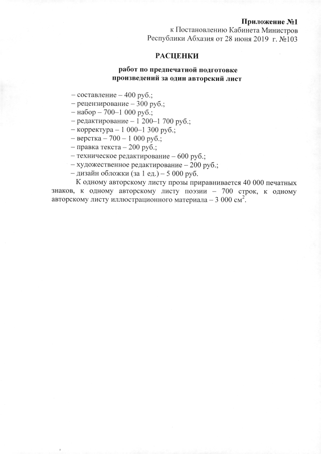 Постановление Кабинета Министров Республики Абхазия от 28.06.2019 №103 "О государственном заказе на издание художественной и иной литературы в Республиканском государственном учреждении <Абхазское государственное издательство> на 2019 год и утверждении Положения о порядке подготовки и издания собраний сочинений, избранных произведений и литературного наследия писателей к юбилейным датам"