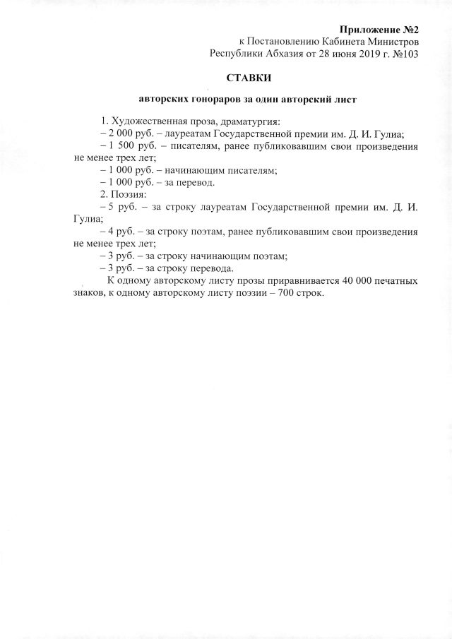 Постановление Кабинета Министров Республики Абхазия от 28.06.2019 №103 "О государственном заказе на издание художественной и иной литературы в Республиканском государственном учреждении <Абхазское государственное издательство> на 2019 год и утверждении Положения о порядке подготовки и издания собраний сочинений, избранных произведений и литературного наследия писателей к юбилейным датам"
