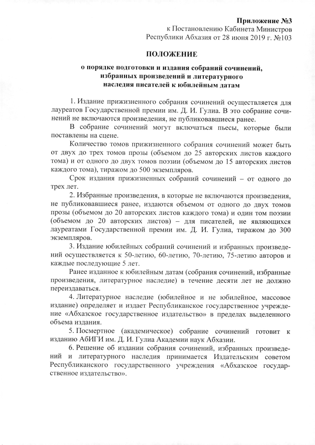 Постановление Кабинета Министров Республики Абхазия от 28.06.2019 №103 "О государственном заказе на издание художественной и иной литературы в Республиканском государственном учреждении <Абхазское государственное издательство> на 2019 год и утверждении Положения о порядке подготовки и издания собраний сочинений, избранных произведений и литературного наследия писателей к юбилейным датам"