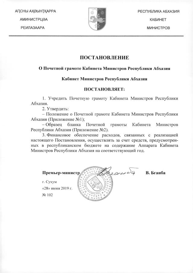 Постановление Кабинета Министров Республики Абхазия от 28.06.2019 №102 "О Почетной грамоте Кабинета Министров Республики Абхазия"