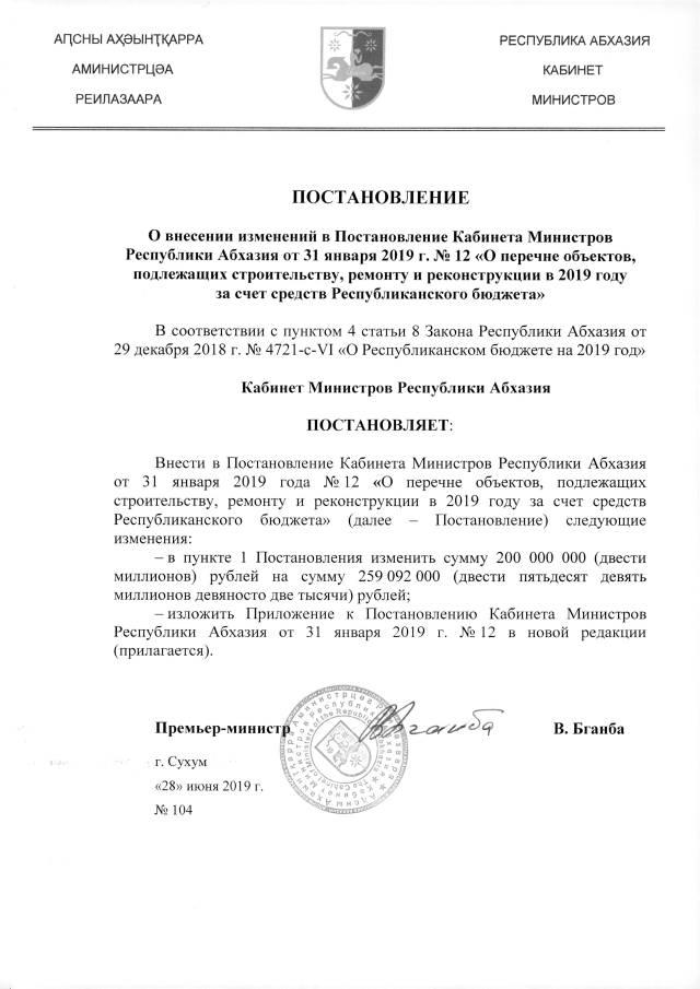 Постановление Кабинета Министров Республики Абхазия от 28.06.2019 №104 "О внесении изменений в Постановление Кабинета Министров Республики Абхазия от 31 января 2019 г. № 12 <О перечне объектов, подлежащих строительству, ремонту и реконструкции в 2019 году за счет средств Республиканского бюджета>"