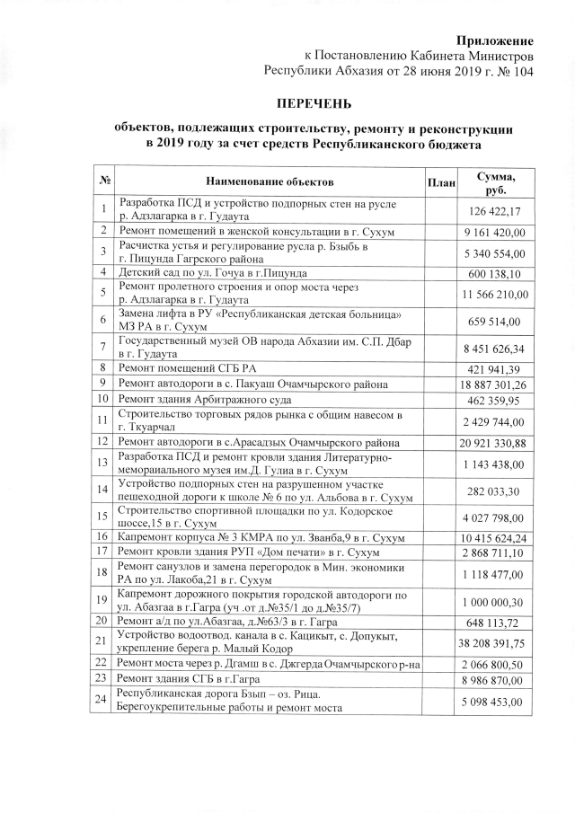 Постановление Кабинета Министров Республики Абхазия от 28.06.2019 №104 "О внесении изменений в Постановление Кабинета Министров Республики Абхазия от 31 января 2019 г. № 12 <О перечне объектов, подлежащих строительству, ремонту и реконструкции в 2019 году за счет средств Республиканского бюджета>"
