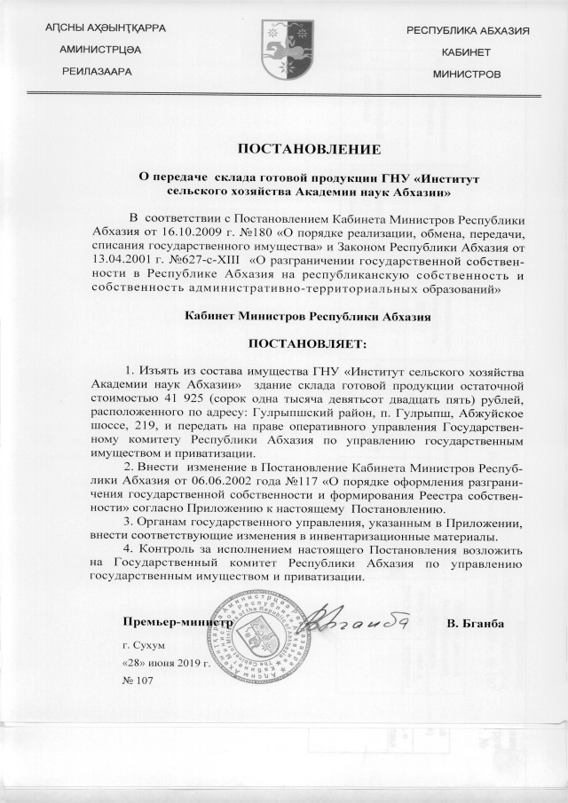 Постановление Кабинета Министров Республики Абхазия от 28.06.2019 №107 "О передаче склада готовой продукции ГНУ <Институт сельского хозяйства Академии наук Абхазии>"