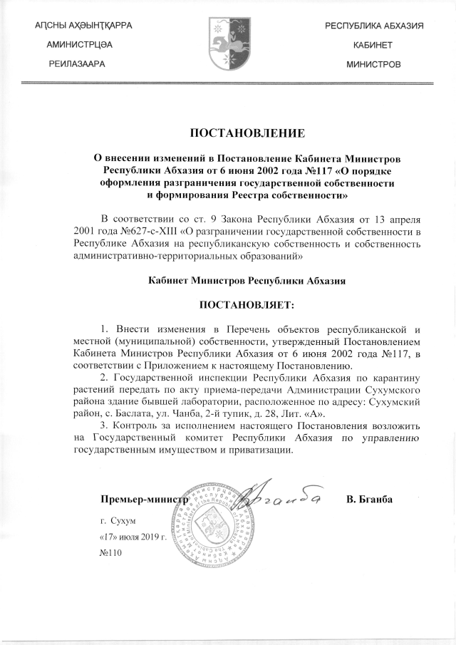 Постановление Кабинета Министров Республики Абхазия от 17.07.2019 №110 "О внесении изменений в Постановление Кабинета Министров Республики Абхазия от 6 июня 2002 года №117 <О порядке оформления разграничения государственной собственности и формирования Реестра собственности>"