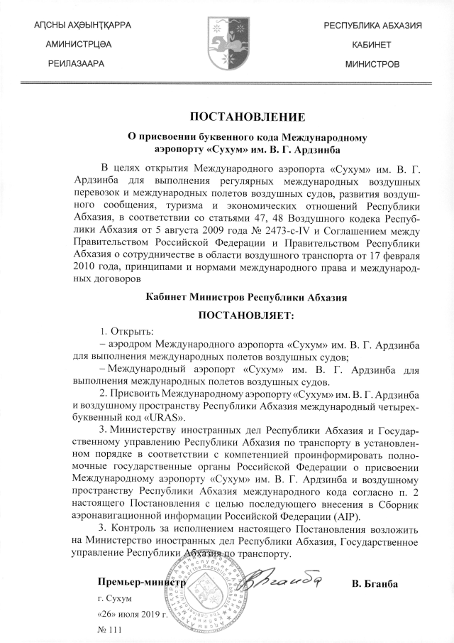 Постановление Кабинета Министров Республики Абхазия от 26.07.2019 №111 "О присвоении буквенного кода Международному аэропорту <Сухум> им. В. Г. Ардзинба"